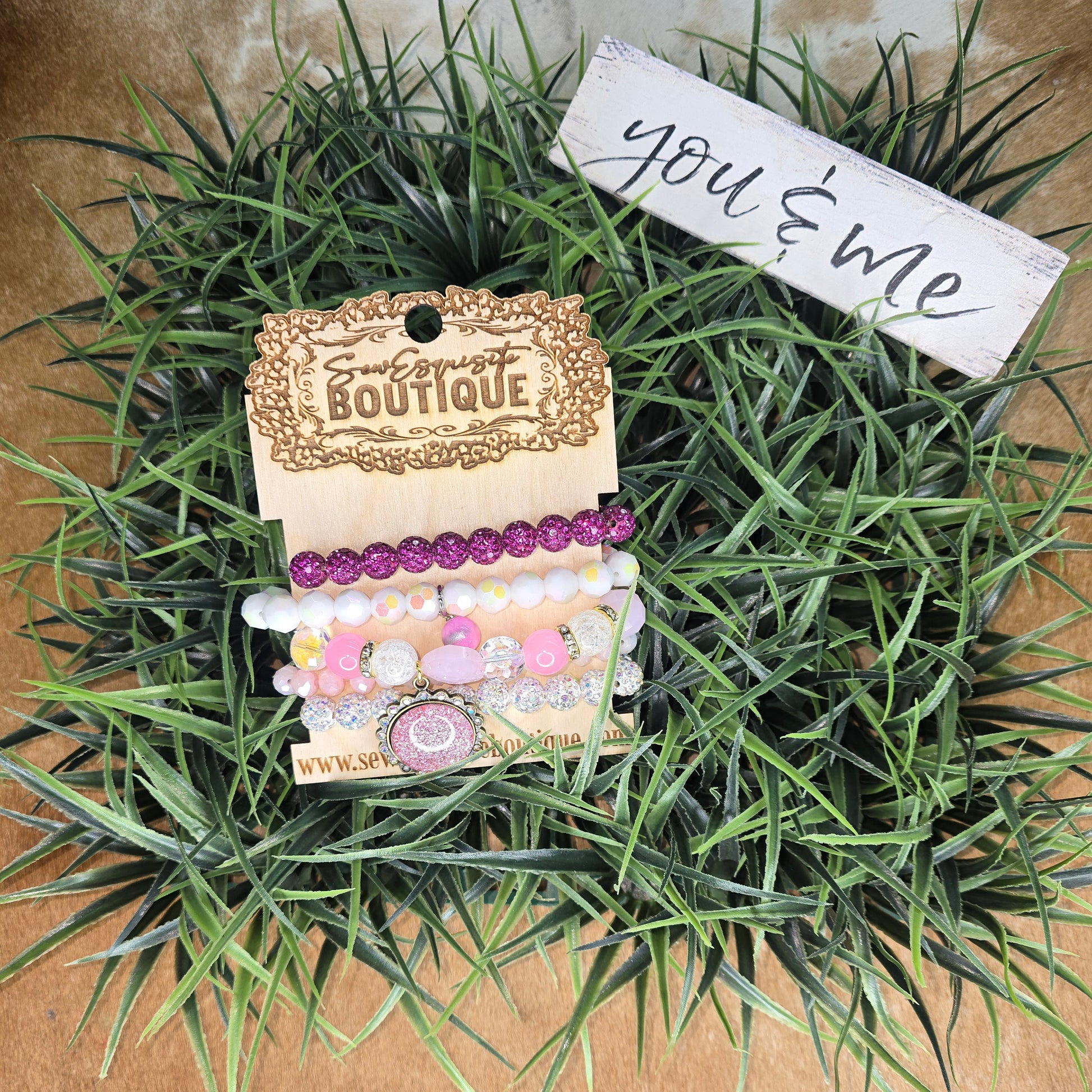 Soft pinks meet shimmering sparkle in this dreamy layered bracelet set 💎 Featuring glittery magenta beads, milky white faceted stones, blush accents, and the sweetest pink heart charm 💕 — this stack is feminine, fun, and full of boutique glam.