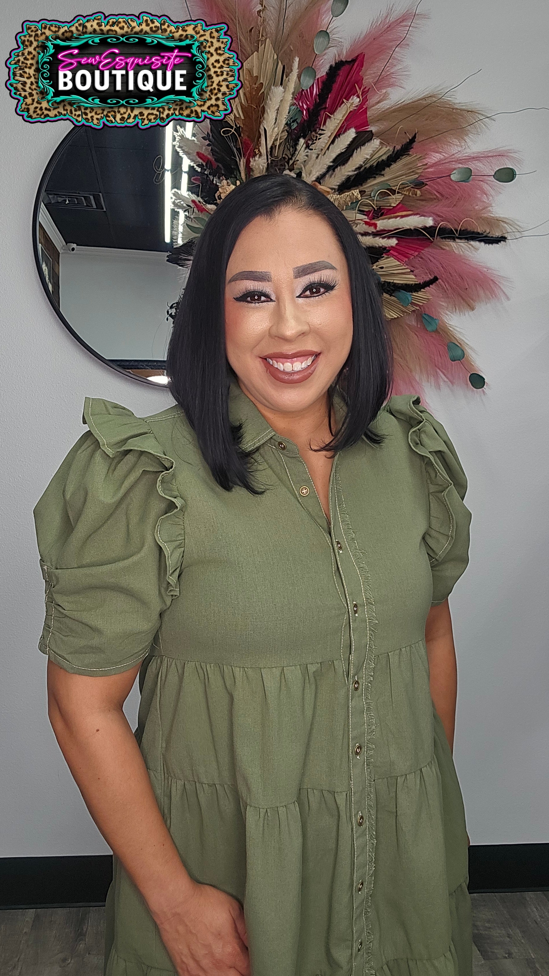 Linen Button Up Shirt Dress with a Ruffled Gathered Sleeve and Frayed Hem Details